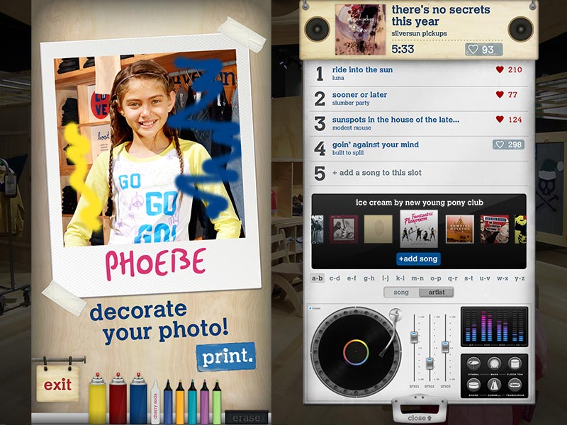 These touchscreens let kids try on virtual outfits, decorate and print their photos, and DJ by playing songs and sounds. Built with Flash.