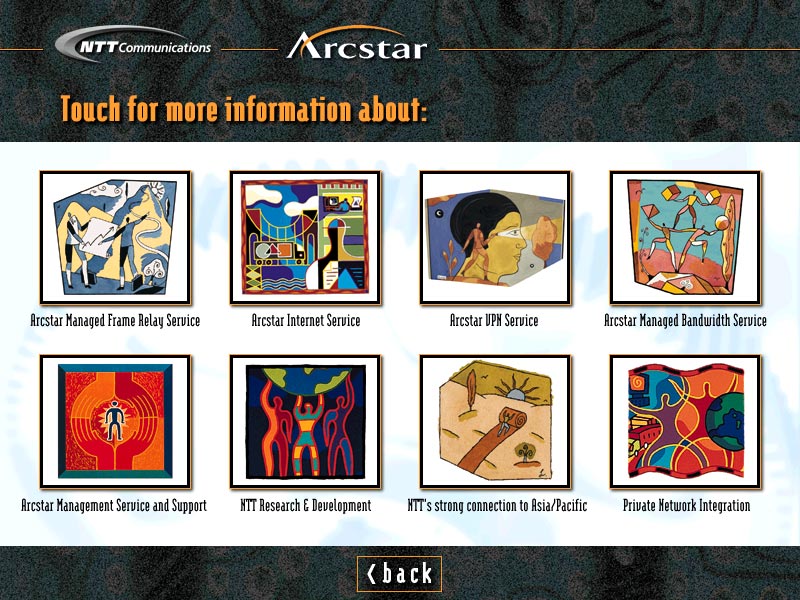 These touchscreen kiosks promoted the Japanese telecom giant's network services at trade shows. Built with Director.